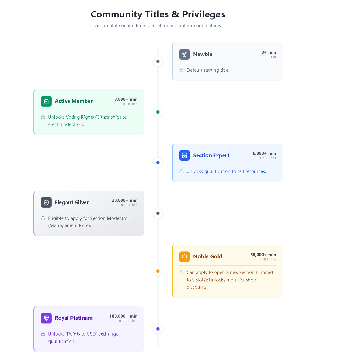Thời gian online của bạn sẽ trực tiếp quyết định "quyền công dân" trong diễn đàn. Dưới đây là ba cột mốc danh hiệu quan trọng nhất, hãy lấy chúng làm mục tiêu tích lũy: