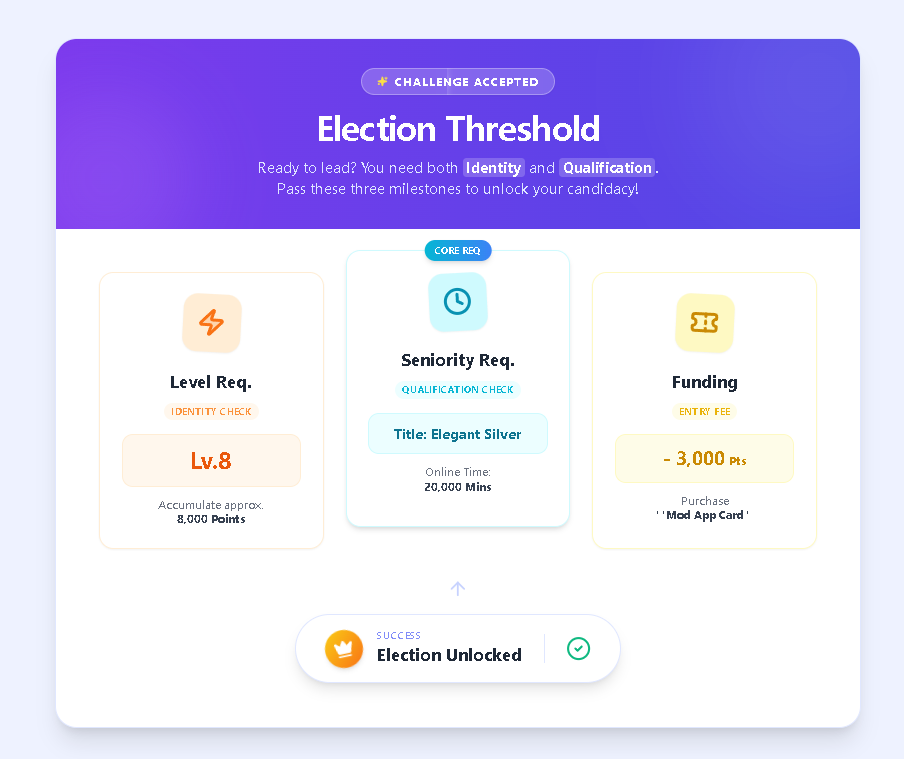 - Tác dụng: Quyết định bạn "có tư cách" sử dụng một tính năng nào đó (ví dụ: có tư cách bỏ phiếu, có tư cách ứng cử mod).